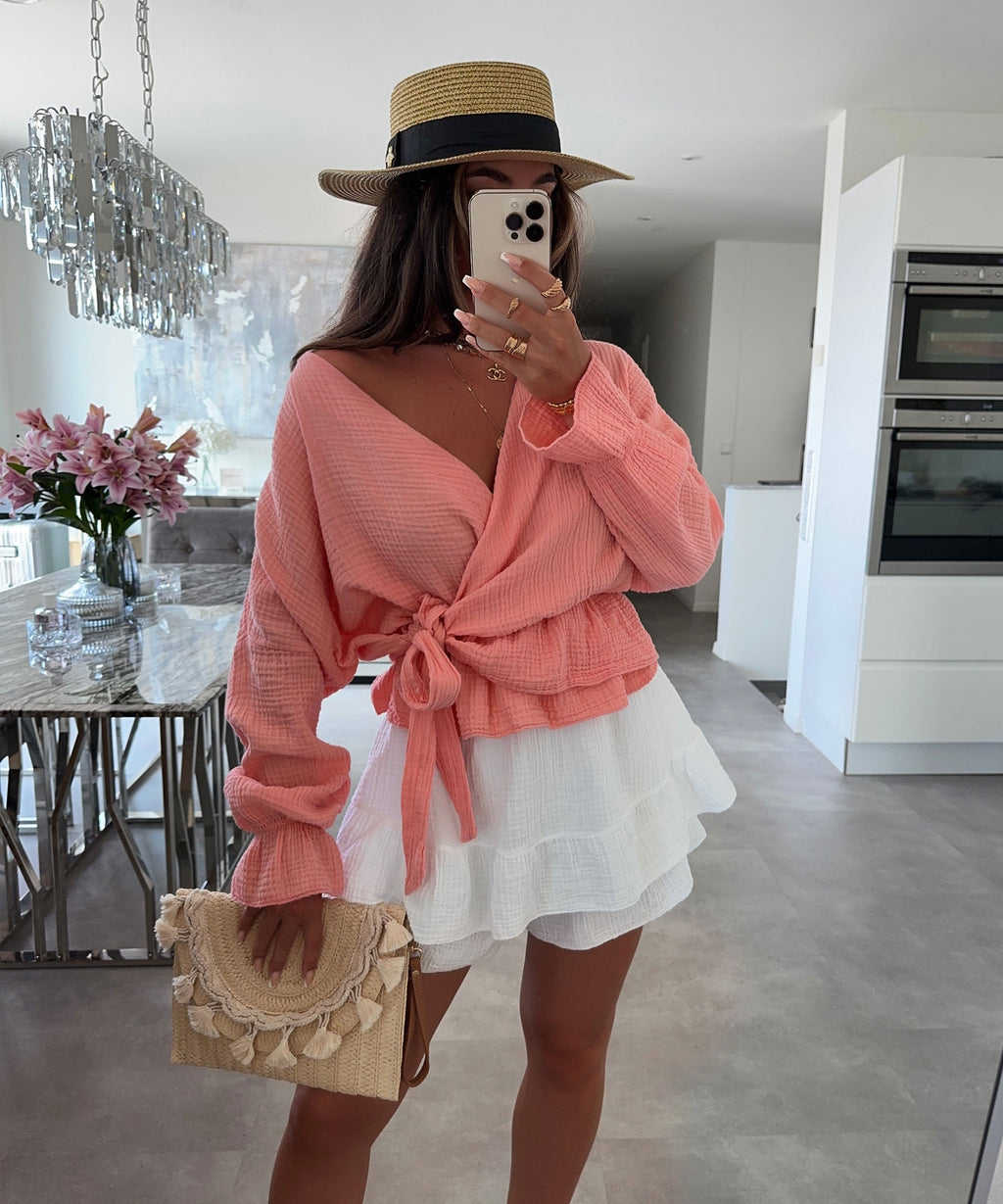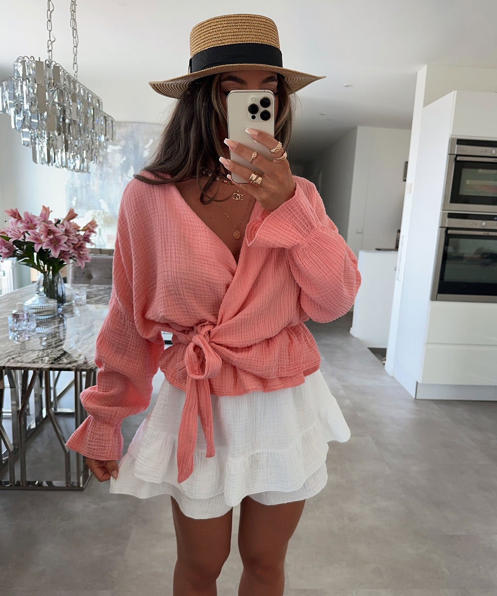 どんな服装も引き立てるこのブラウスは、さりげないピーチの色合いと洗練されたディテールでエフォートレスな魅力を演出。