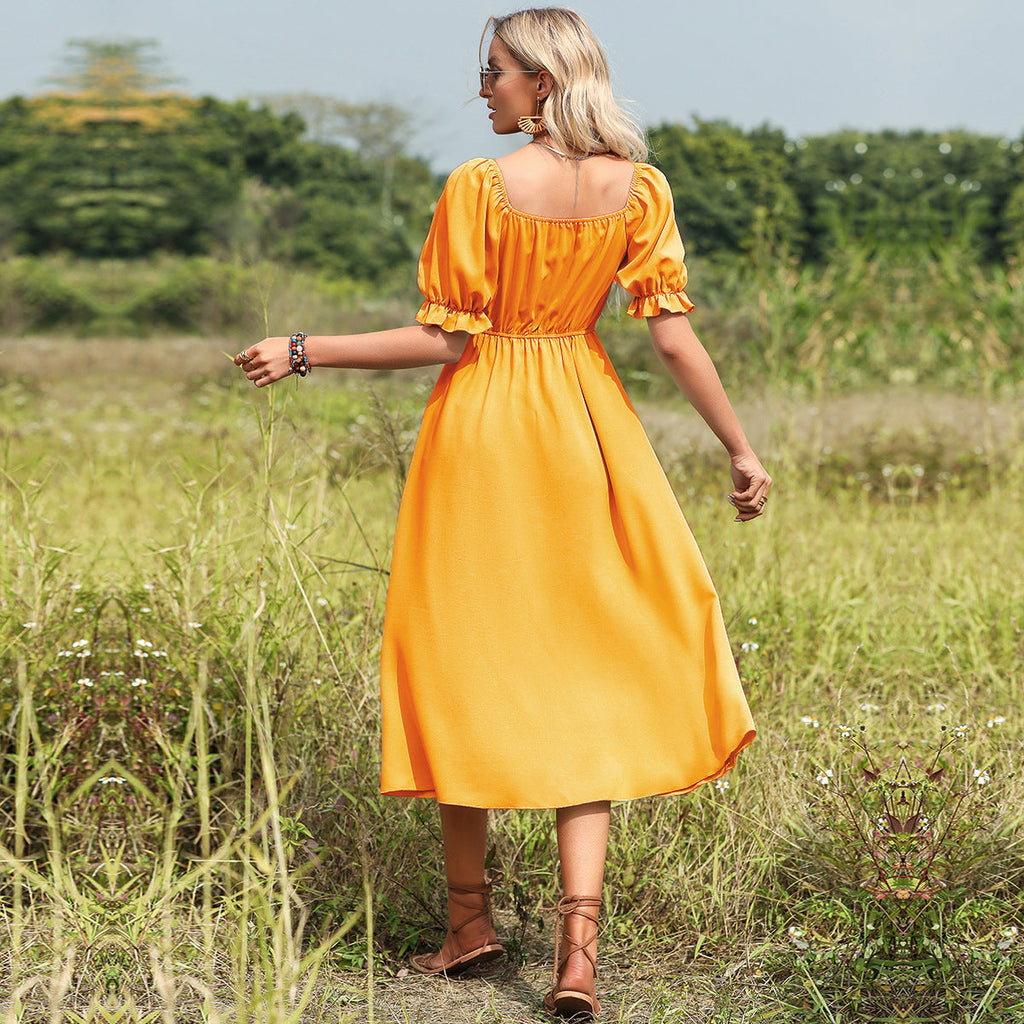 このミディ丈のドレスには繊細なリボンのディテールが施されており、ロマンチックな雰囲気を醸し出しています。軽くて流れるような生地が美しくドレープし、カジュアルなお出かけにもエレガントな夜にも最適です。