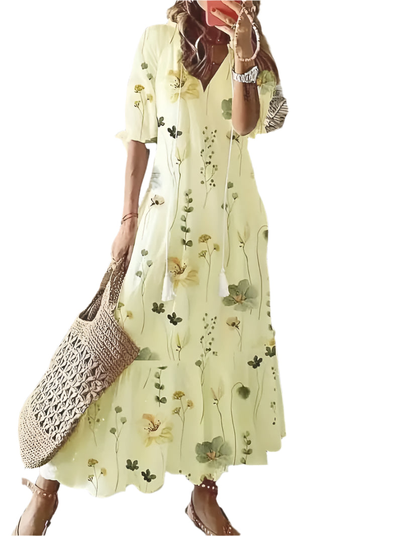 エリザ- フローラル ボヘミアン V ネック マキシ ドレスは、魅力的な花柄プリントと軽やかで流れるようなデザインで、ファッションの自由な精神を強調します。リラックスした午後やカジュアルな夜にぴったりのこのドレスは、快適さとスタイルが融合しています。