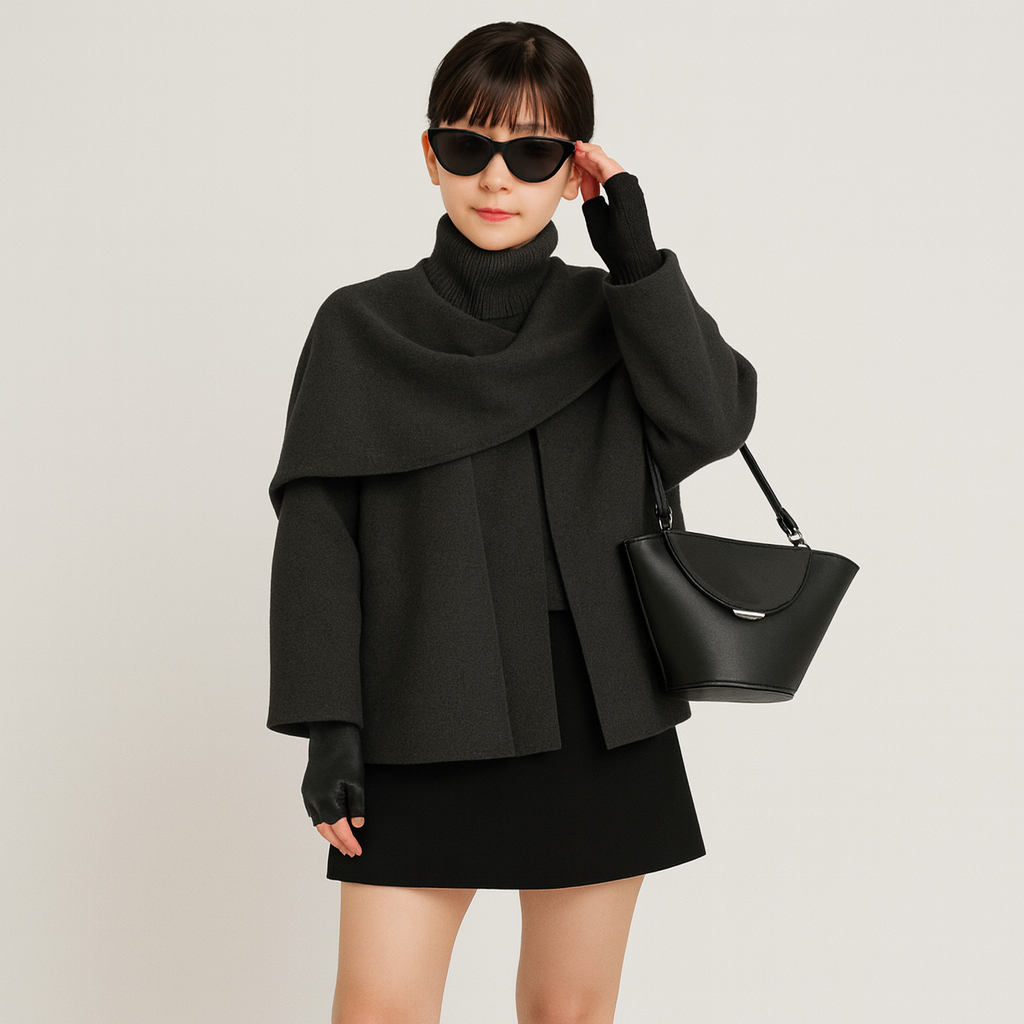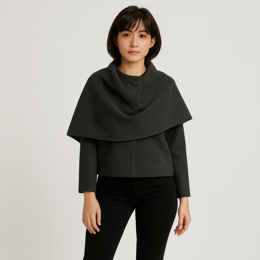 エリッセ| ドレープウールブレンドケープジャケットで、時代を超えた優雅さを体感してください。スタイルと快適さを両立させたい女性のためのステートメントピースです。流れるようなドレープシルエットと柔らかなウールブレンドが、肌寒い日にぴったりの、エレガントで温かみがあり、洗練された雰囲気を醸し出します。街歩きにも、エレガントなイブニングにも、このケープジャケットはどんな装いにもラグジュアリーな雰囲気を添えます。