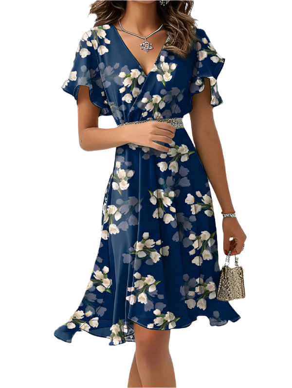 エルシー フローラルプリント半袖 V ネックミニドレス