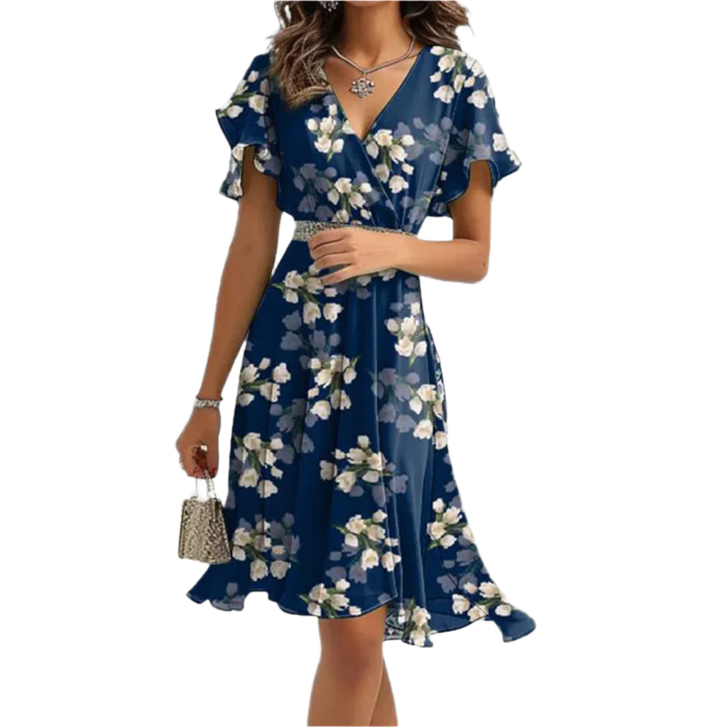 エルシー– 半袖 V ネック フローラル プリント ミニ ドレスは、女性らしさを簡単に取り入れられる頼りになるドレスです。魅力的な V ネックラインと流れるようなシルエットでデザインされたこのミニドレスは、快適さとスタイルの完璧な組み合わせです。街を散歩するときも、夏のブランチを楽しむときも、このドレスを着れば気楽にシックな印象を演出できます。
