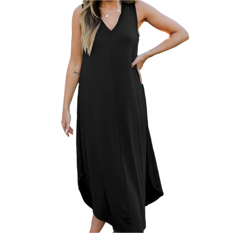 クローデット- V ネックのノースリーブ ドレスは、スタイリッシュでエレガントな日にぴったりの選択肢です。流れるようなシルエットと美しい V ネックラインが特徴のこのドレスは、カジュアルなお出かけにもエレガントな夜会にもぴったりな、時代を超えた魅力を放ちます。