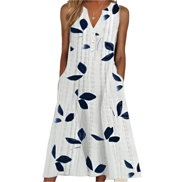 ケリー - シックなリーフプリントのノースリーブミディドレス