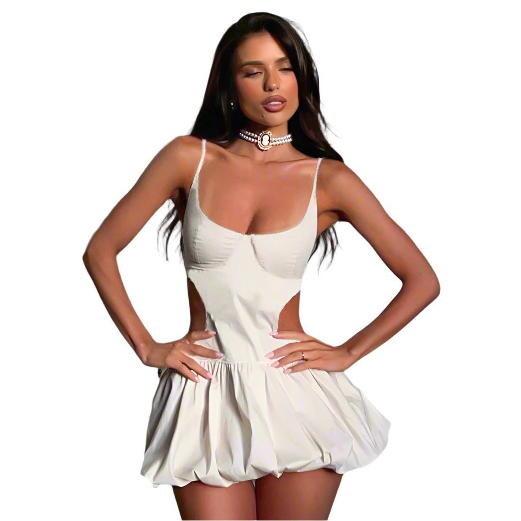 このミニドレスは細部にまでこだわりました。ウエストの遊び心のあるカットアウト、エレガントなスパゲッティストラップ、洗練されたバックレスデザインが目を引く一着です。柔らかく軽量な生地が一日中快適さを保証し、カーブした裾が見た目に楽しいタッチを加えます。サンダルやスニーカーと合わせてデイタイムのカジュアルな装いに、ヒールやアクセサリーを合わせて夜のイベントに着こなしてください。