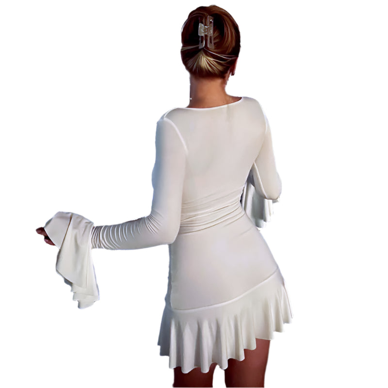 この軽やかなドレスは細かいディテールにこだわっています。流れるようなシルエット、わずかにくびれたウエスト、ひらひらとした袖が、自然な動きに沿う美しいシルエットを作り出します。裾と胸元に施されたフリルのディテールが、スタイリッシュな見た目を保ちながら、ロマンチックで遊び心のある表情をプラスします。エレガントな夜にはヒールを、カジュアルな日にはフラットシューズと合わせてスタイリングしてください。
