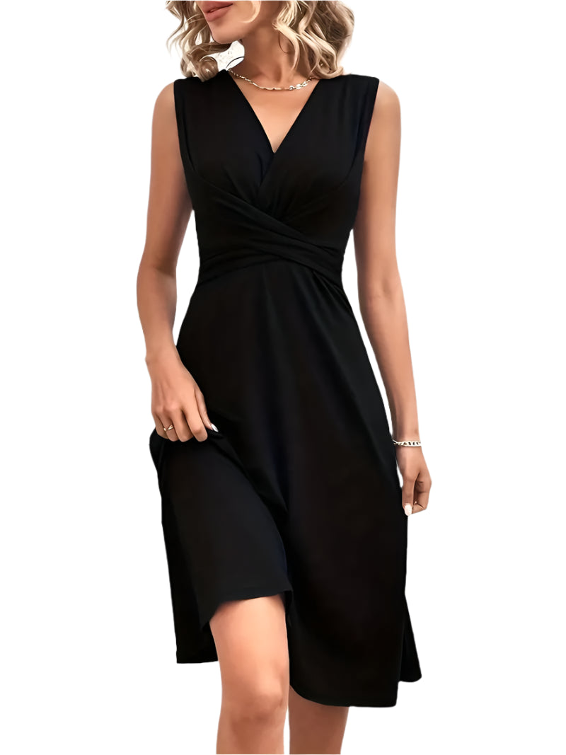 ジョージーン – クロスした V ネックのルーシュ ドレスは、優雅さと気品の象徴です。魅力的なルーシュデザインと時代を超えたクロスVネックが特徴のこのドレスは、自然なシルエットを強調し、どんな場面にもぴったりです。