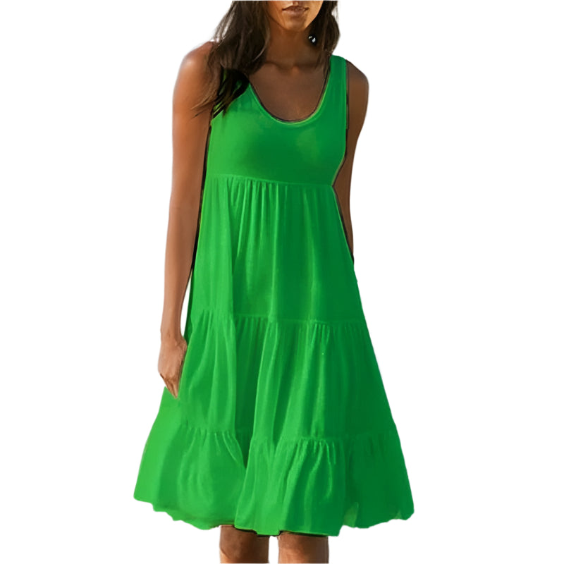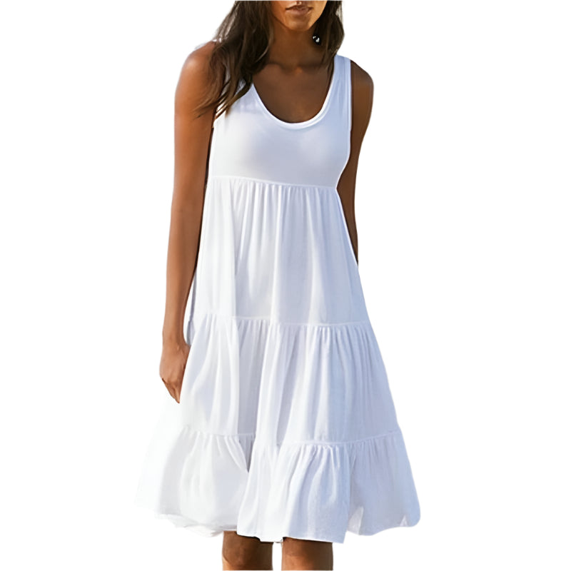 テレーズ- 無地ノースリーブミディビーチドレスで、気楽なスタイルを楽しみましょう。晴れた日のためにデザインされたこのノースリーブのミディドレスは、流れるようなシルエットで美しいフィット感を提供します。ビーチ旅行やカジュアルな散歩に最適で、夏のワードローブにエレガントな雰囲気を添えます。