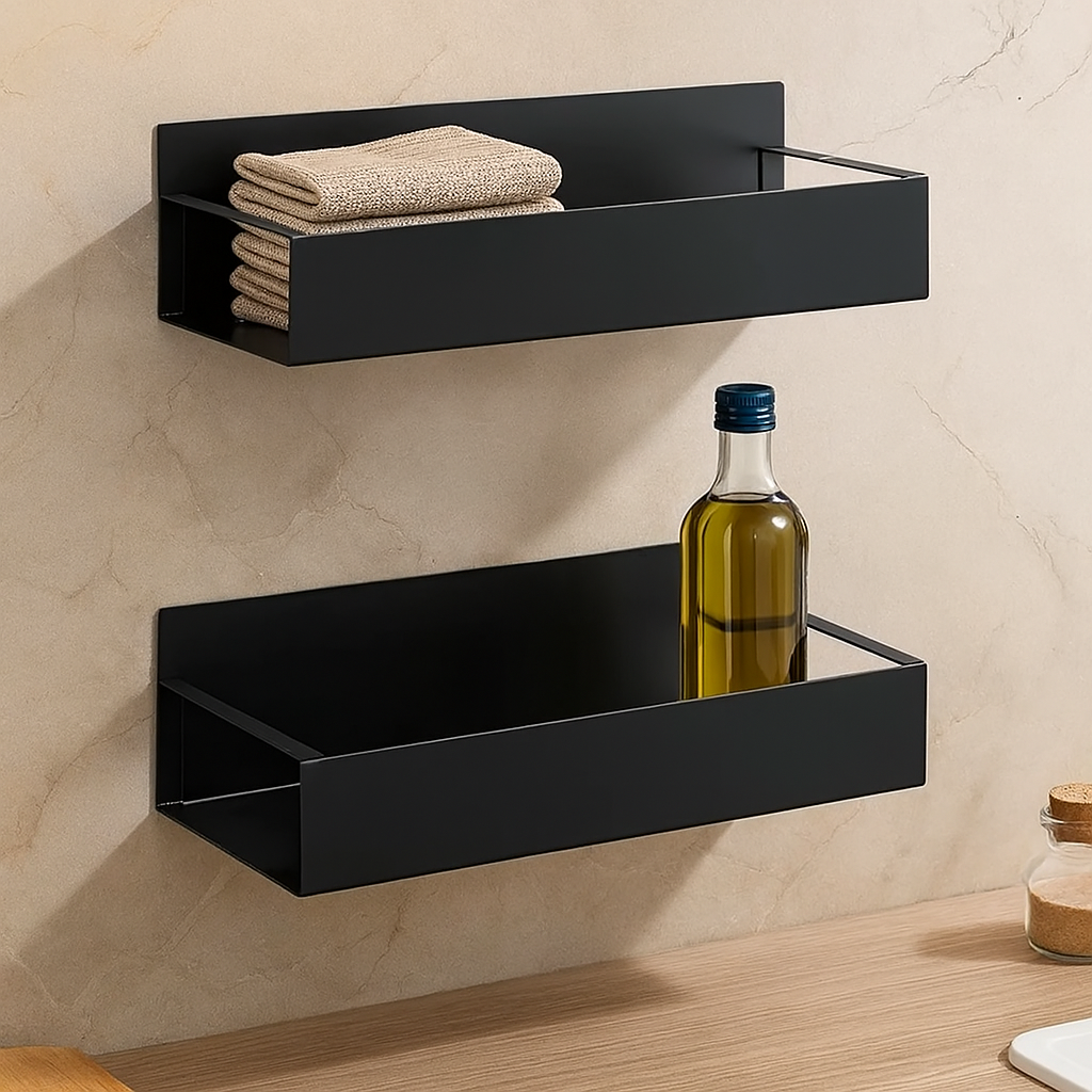 洗練されたブラックメタル仕上げとコンパクトな形状のこのシェルフは、モダンなインテリアに自然に溶け込みます。キッチンではスパイスや小さな瓶の収納に、ランドリールームでは洗濯洗剤、乾燥機用シート、その他の小物類の収納にお使いいただけます。賃貸住宅にお住まいの方や、省スペースで傷をつけずに整理整頓したい方に最適です。