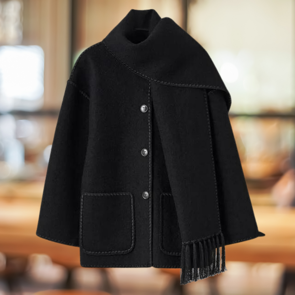 マチルド - ボタンとスカーフが付いたエレガントなシングルブレストジャケットは、モダンなファッションと時代を超越した洗練を兼ね備えています。多用途に使えるこのジャケットは、どんなワードローブも難なく引き立て、カジュアルにもエレガントなお出かけにもぴったりです。