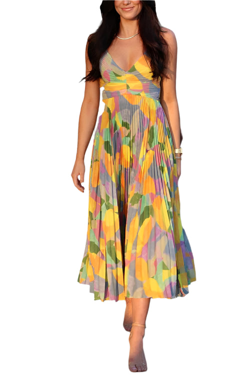 マーガレット - Vネックのプリント入りハイウエストプリーツミディキャミドレスでエレガントに着こなしましょう。エレガントな V ネックラインとプリーツ入りのミディ シルエットでスタイルを強調するようにデザインされたこのドレスは、カジュアルな集まりにもフォーマルな集まりにもぴったりの、時代を超えた魅力を備えています。