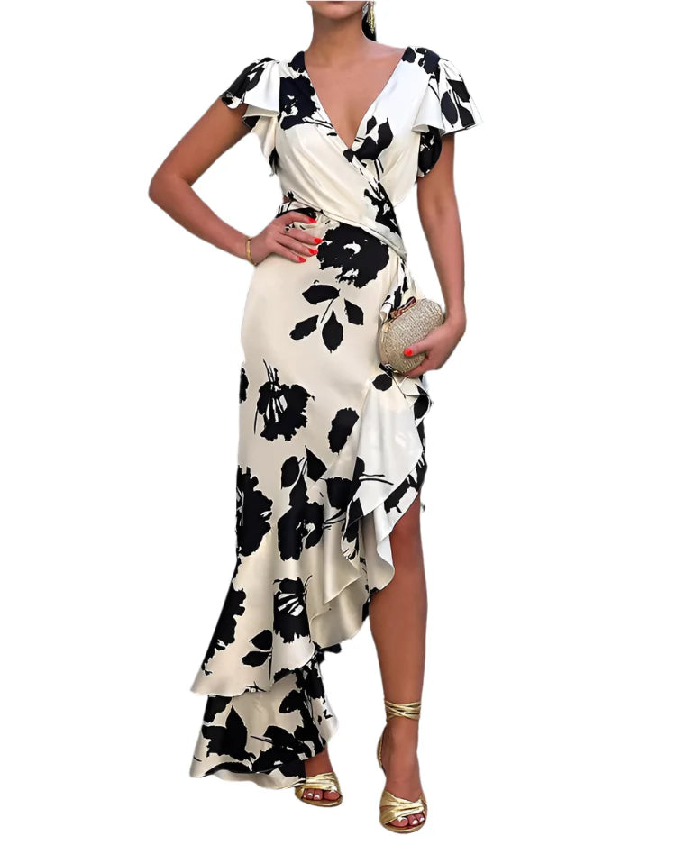 注目を集めるマーシー- Vネックとフリル袖のプリントドレス。遊び心のあるパターンとエレガントなデザインを組み合わせたフェミニンなステートメントドレスです。女友達とランチに行くときでも、カジュアルな日帰り旅行のときでも、このドレスは快適さとスタイルを兼ね備えています。