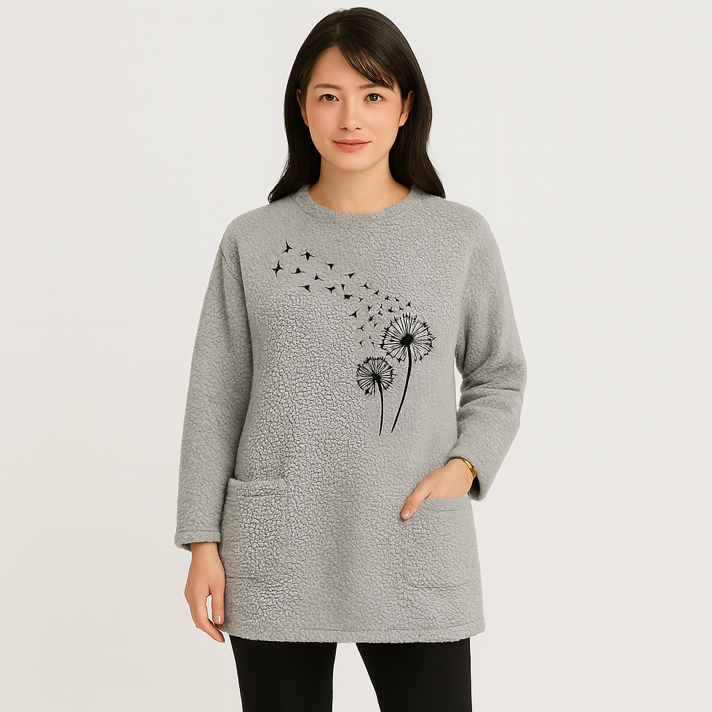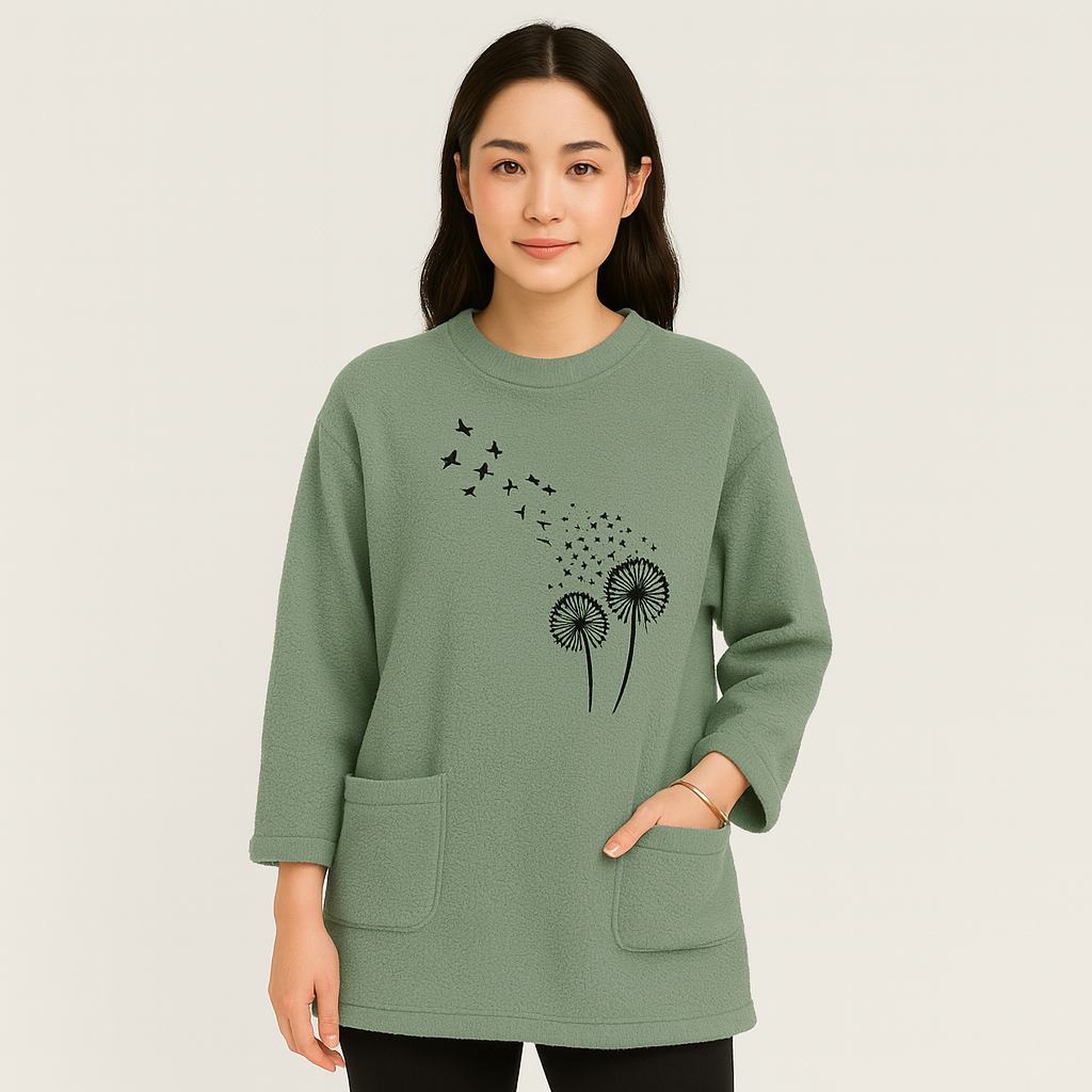 マーレンは、フロントに繊細なタンポポのプリントを施した印象的な一着です。クラシックなラウンドネックと長袖が、タイムレスなスタイルを演出。普段使いにもカジュアルにもぴったりです。