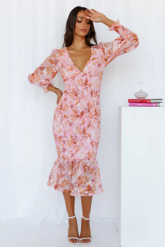 レベッカ-花柄ミディドレスは、時代を超越したエレガンスとモダンな花柄が融合。流れるようなシルエットが体型を美しく見せ、カジュアルなお出かけから特別なイベントまで、どんなシーンにもぴったり。