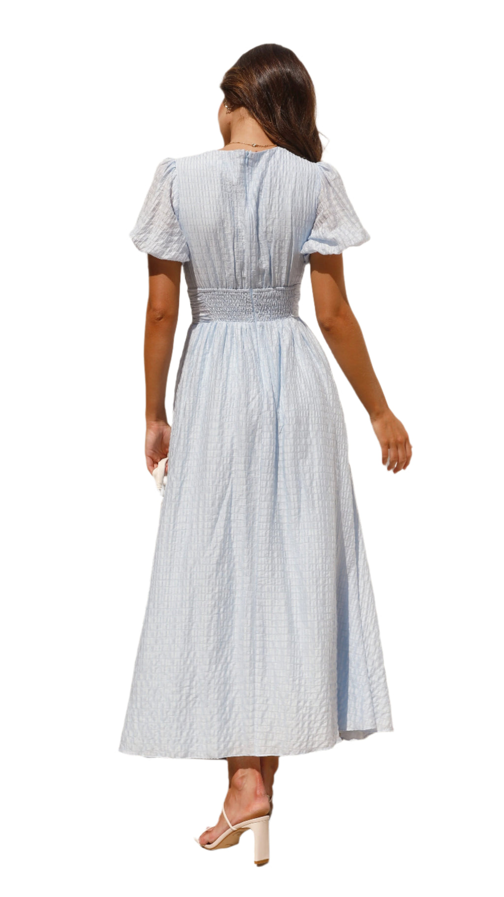 軽量な生地とゆったりとしたフィット感の ヴィヴィアンドレスは、スタイルを損なうことなく快適さを提供します。深いVネックラインが上半身を美しく見せ、ややくびれたウエストが自然な体型を強調します。プリーツのディテールが質感と優雅さを加え、ヒールでドレスアップしたり、サンダルでカジュアルダウンしたりできます。夏のワードローブに欠かせないドレスです。