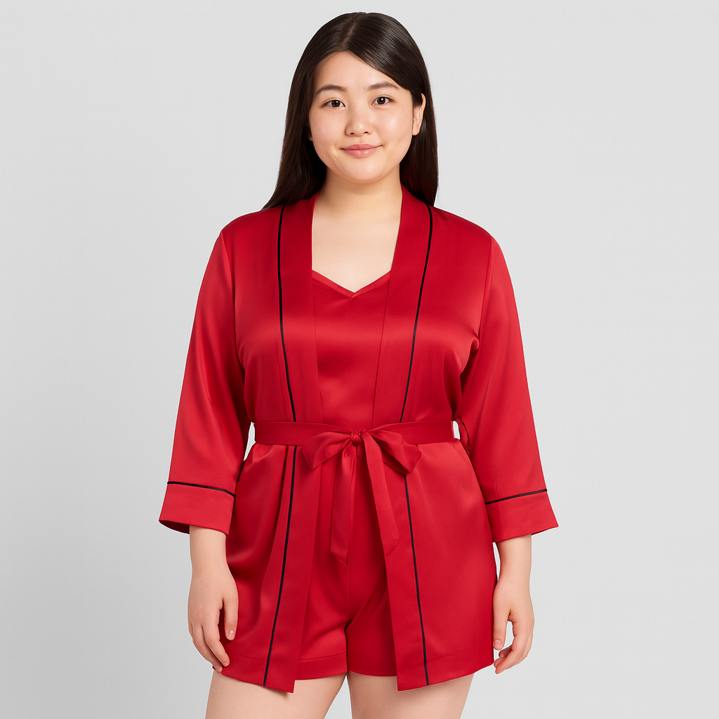 上品で洗練されたデザインが魅力の女性用サテンパジャマ3点セット。滑らかな肌触りと美しい光沢が、心までときほぐすリラックスタイムを演出します。やわらかな質感と女性らしいシルエットが、毎晩を特別なひとときへと導きます。