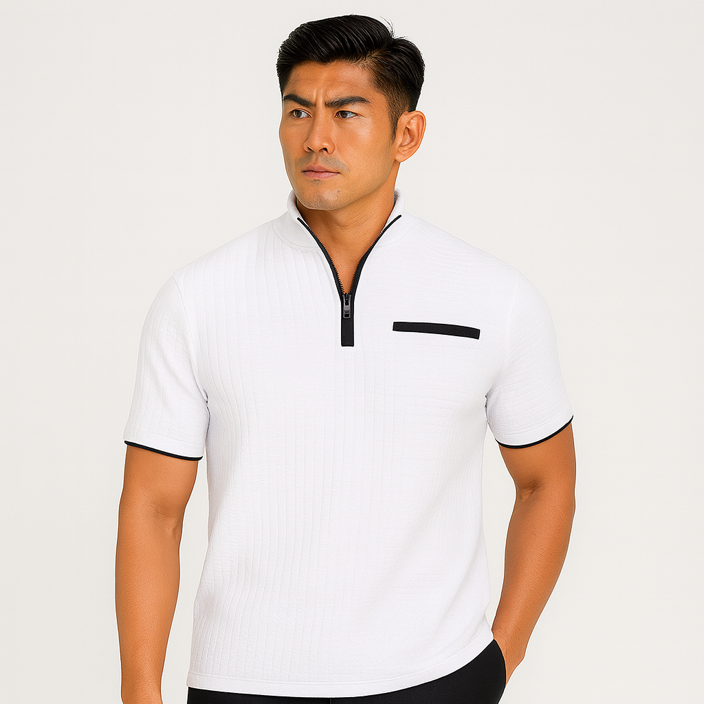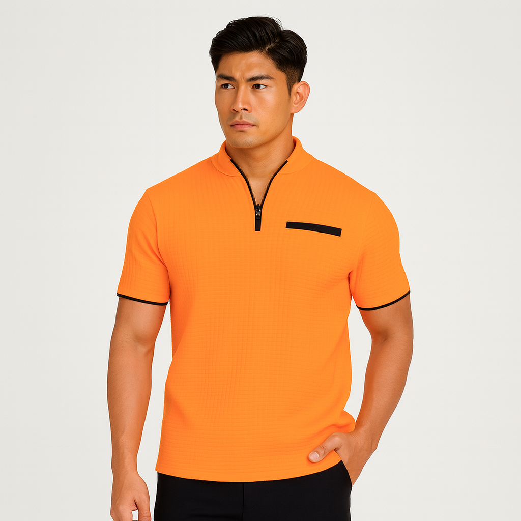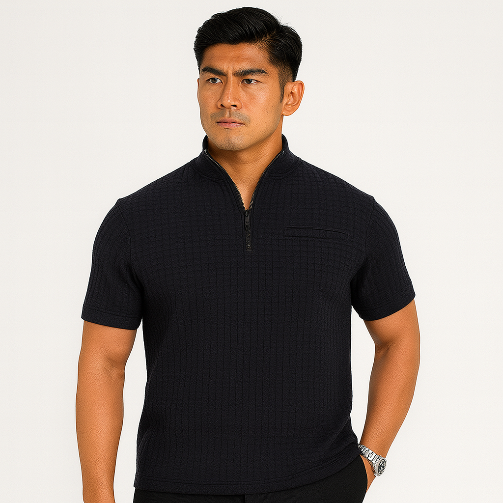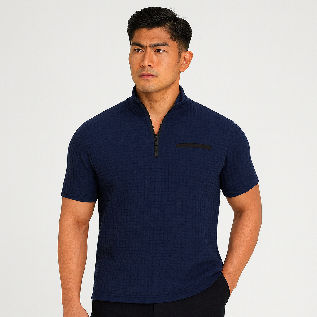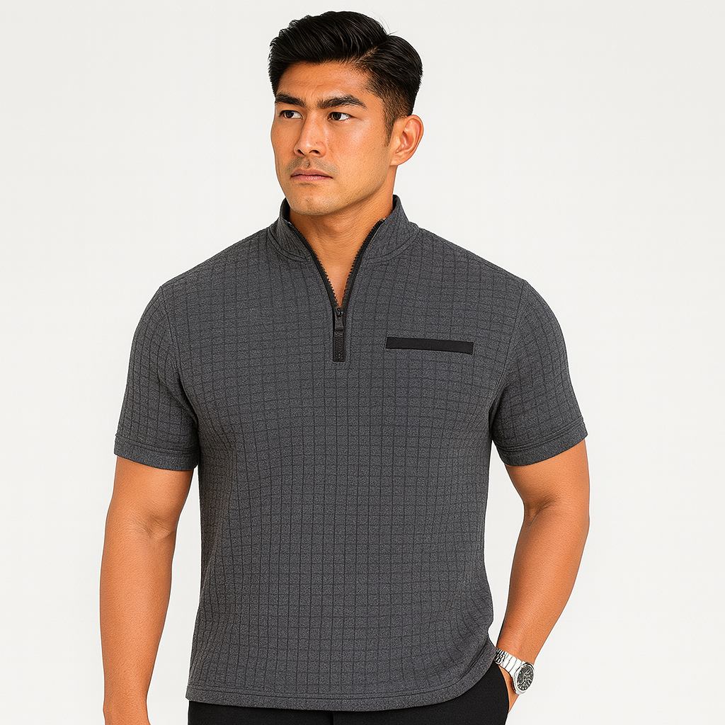 錬心|チェックポロシャツは、軽やかで上品な印象を与える一枚。ジップ付きのフロントデザインとチェック柄が、夏の装いに爽やかなアクセントを添えます。